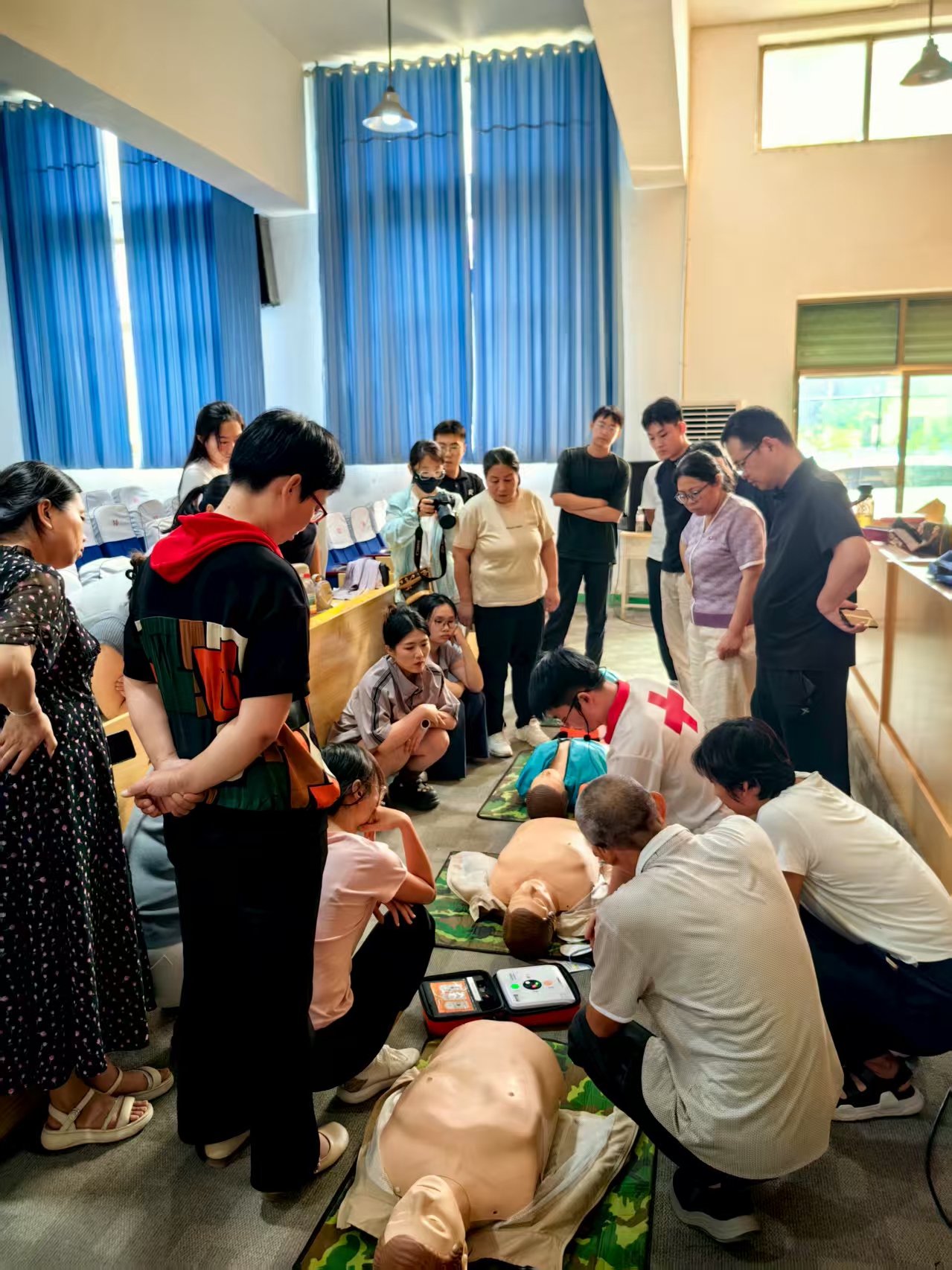 培训中,梁老师讲解了心肺复苏的操作流程、自动体外心脏除颤仪使用方法等应急救护培训知识。重点对心肺复苏的操作步骤进行了详实讲解,如意识判断、呼吸判断、胸外按压、开通气道、人工呼吸等。在实操环节中,梁老师用通俗易通的语言讲解心肺复苏操作的技巧及注意事项,让培训的老师们迅速掌握心肺复苏的技能。培训结束后进行了考核,最终80余名老师顺利通过考核,取得心肺复苏(CPR+AED)培训证书。
